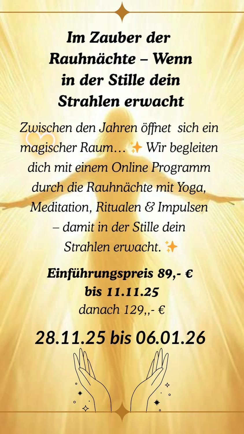 Am 28. November 2025 treffen wir uns zu einem Onboarding-Call über Zoom, in dem du alle wichtigen Informationen und Impulse zur Vorbereitung erhältst – damit du dich entspannt und bewusst auf diese besondere Zeit einstimmen kannst. 🤍